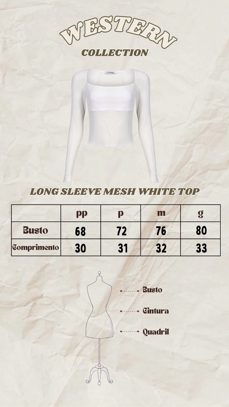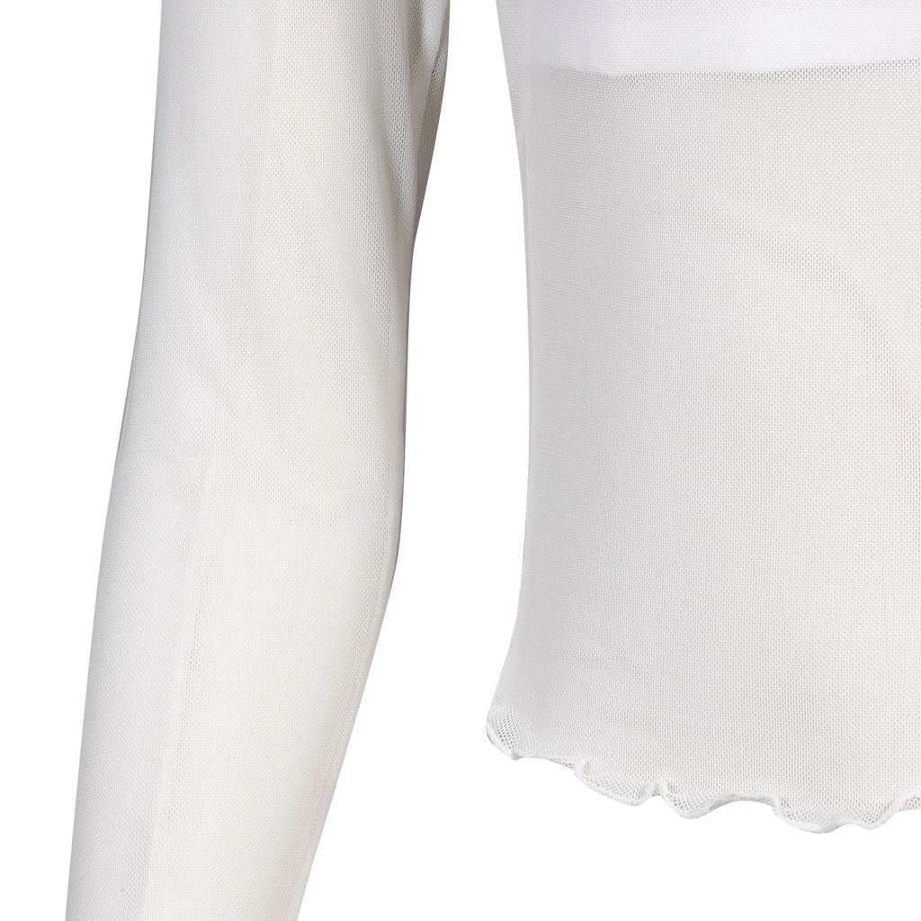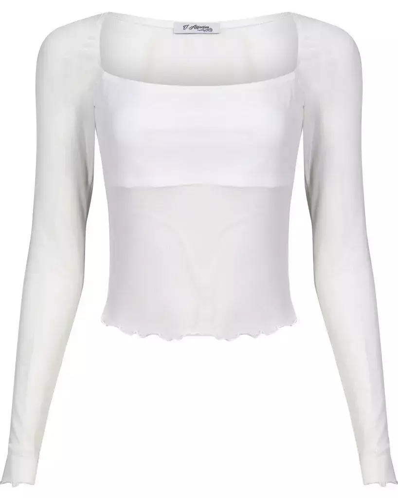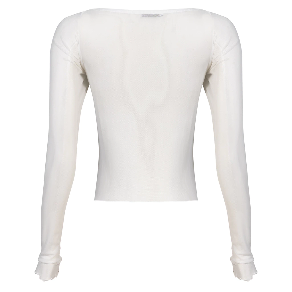 - Confeccionando em tule branco o LONG SLEEVE MESH WHITE TOP possui mangas longas e forro duplo de suplex no busto, acamantos em fru-fru na barra e manga