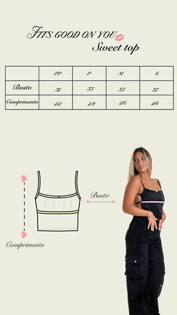 - The cutest top it's here! Nosso sweet top é feito com a melhor viscose nacional de toque muito sedoso, sua modelagem frente única vai fazer com que seja seu top favorito no armário. Ele conta também, com aviamentos delicados, que trazem o ar romântico que esperamos da primavera, além de possuir reguladores na alça e fita de veludo abaixo do busto que promovem melhor sustentação para várias medidas <3